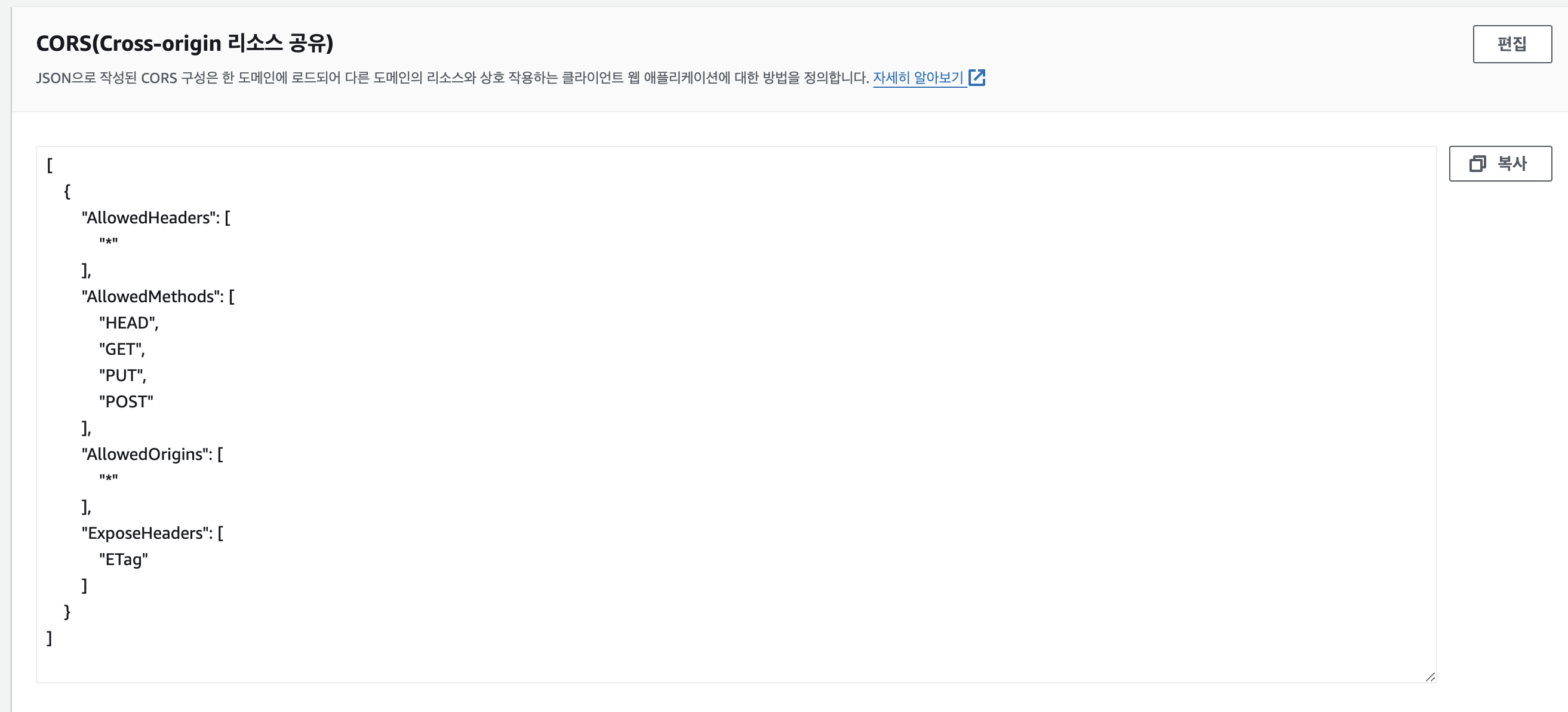 우리가 봐야할 부분은 버킷 정책과 CORS 설정이다.