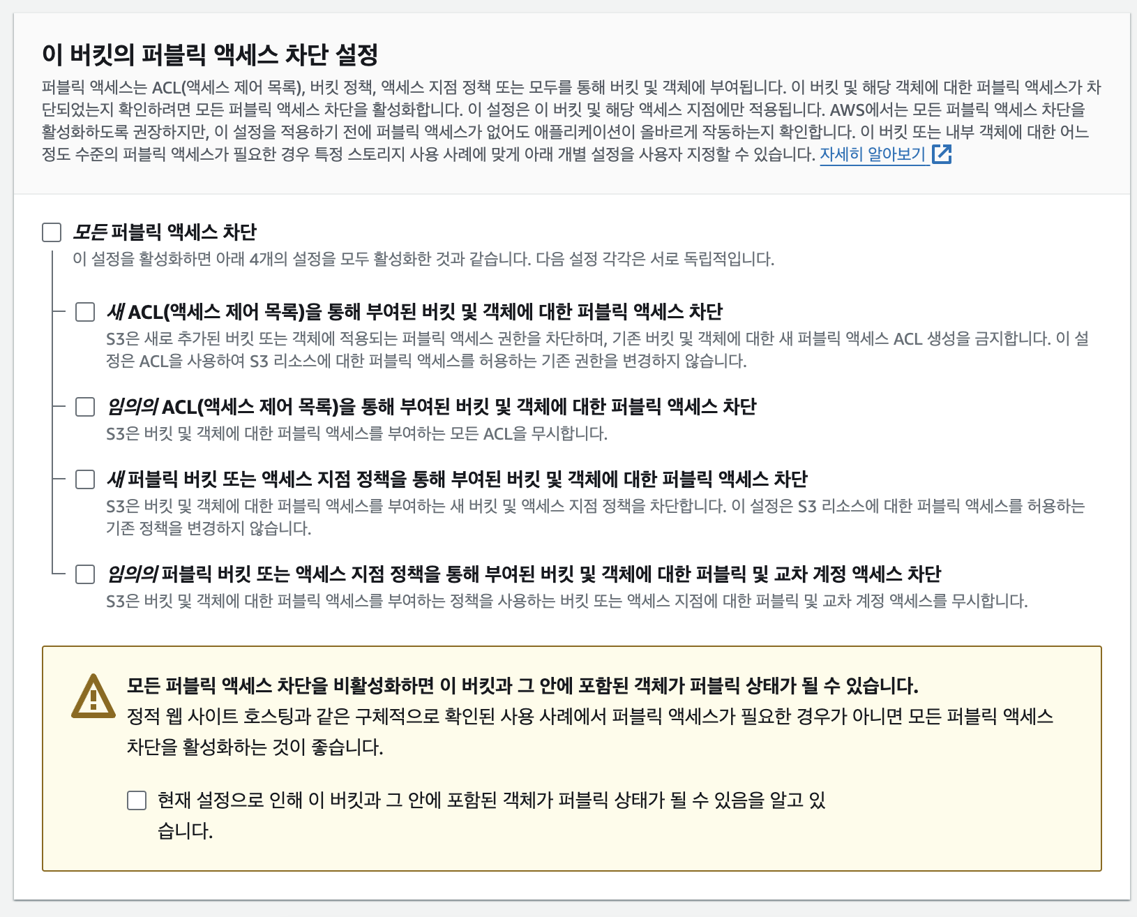 이후 퍼블릭 액세스 차단에서 항목을 모두 체크하면 끝!