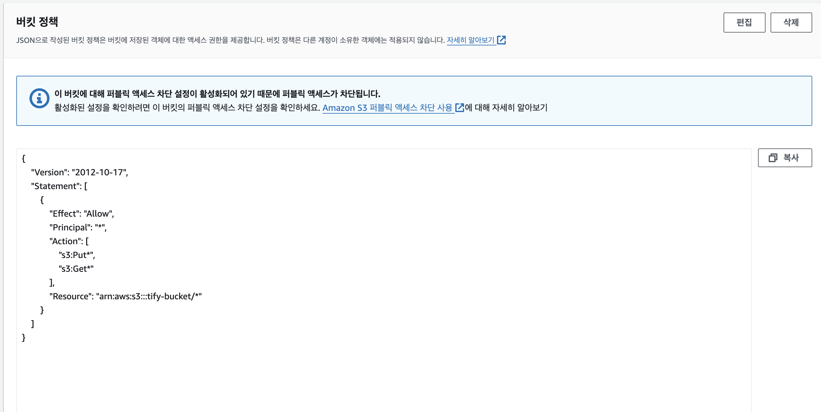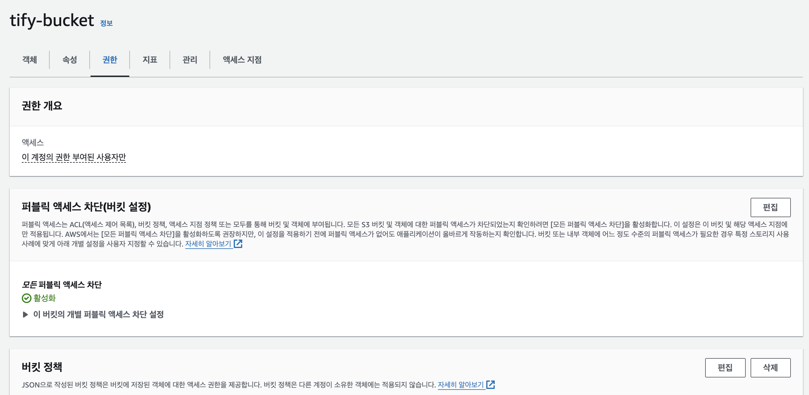 위에서 말한 버킷 public/private 설정을 퍼블릭 액세스 차단(버킷 설정)에서 할 수 있다.
