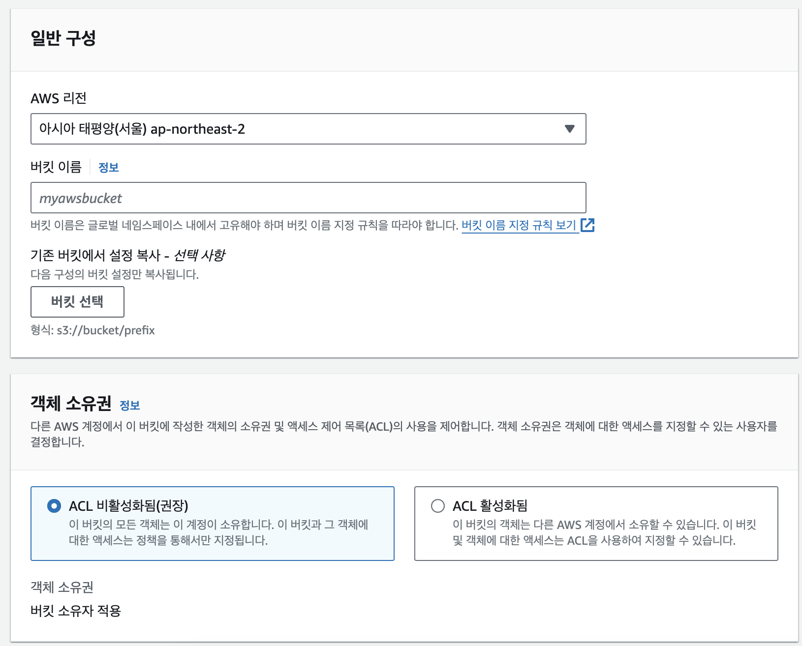 첫 번째 사진에서는 버킷의 이름을 설정하고