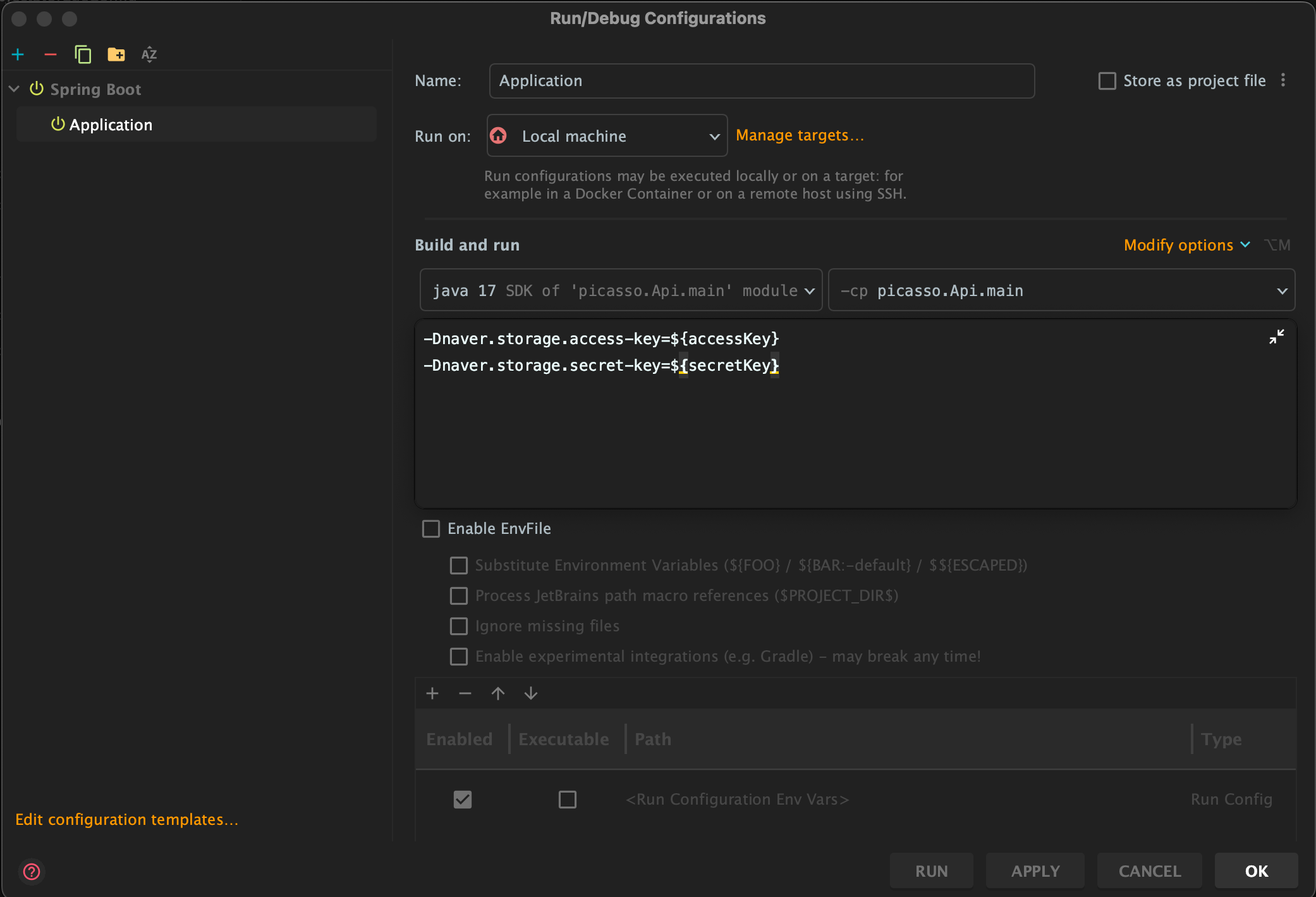 나머지 accessKey와 secretKey는 VM option으로 지정해주었다.