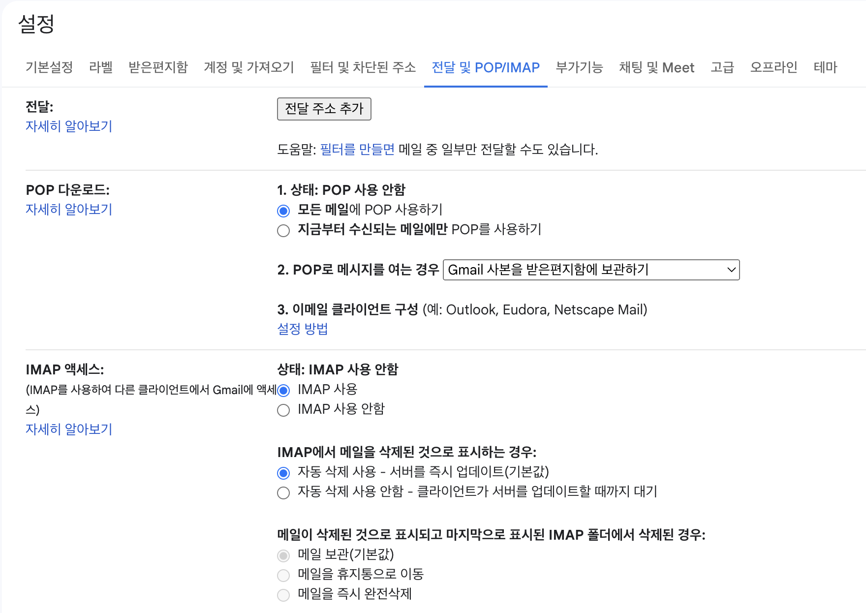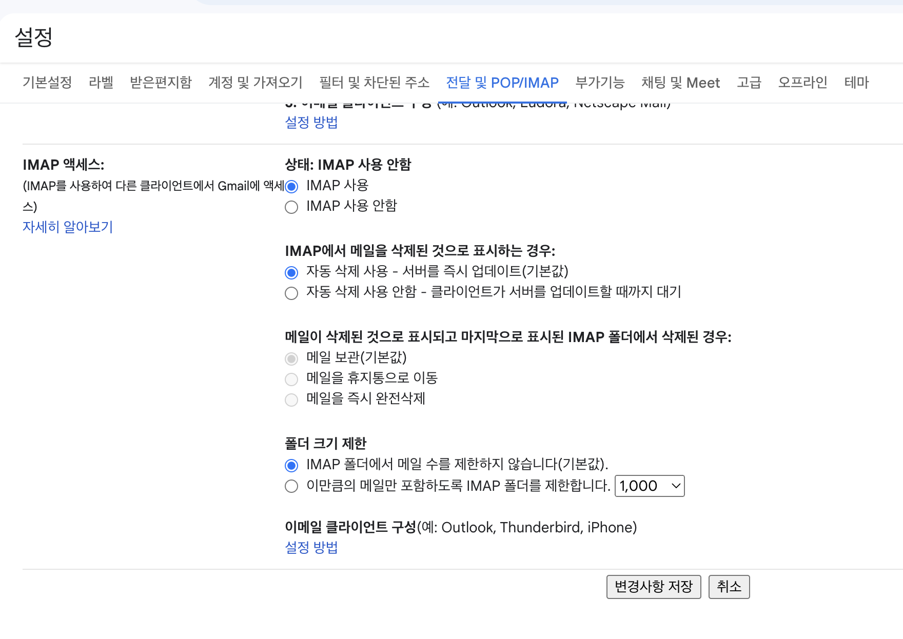 IMAP 및 POP 관련 설정은 아래 더보기에 서술해놓았다.